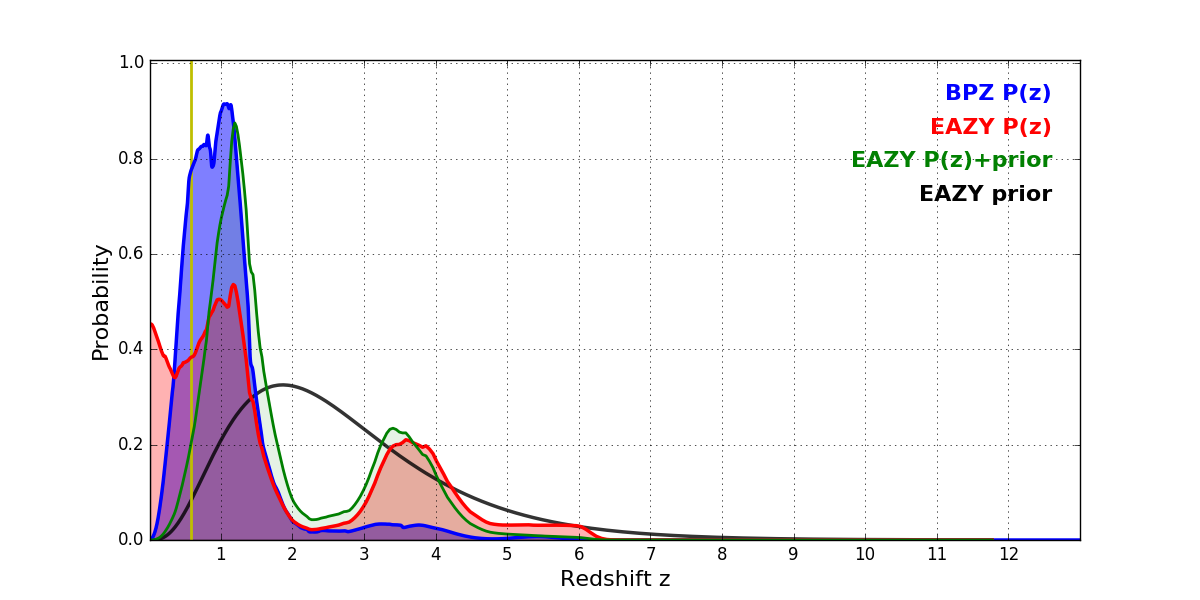 In P(z) plots: Yellow lines mark the cluster redshift z = 0.586,