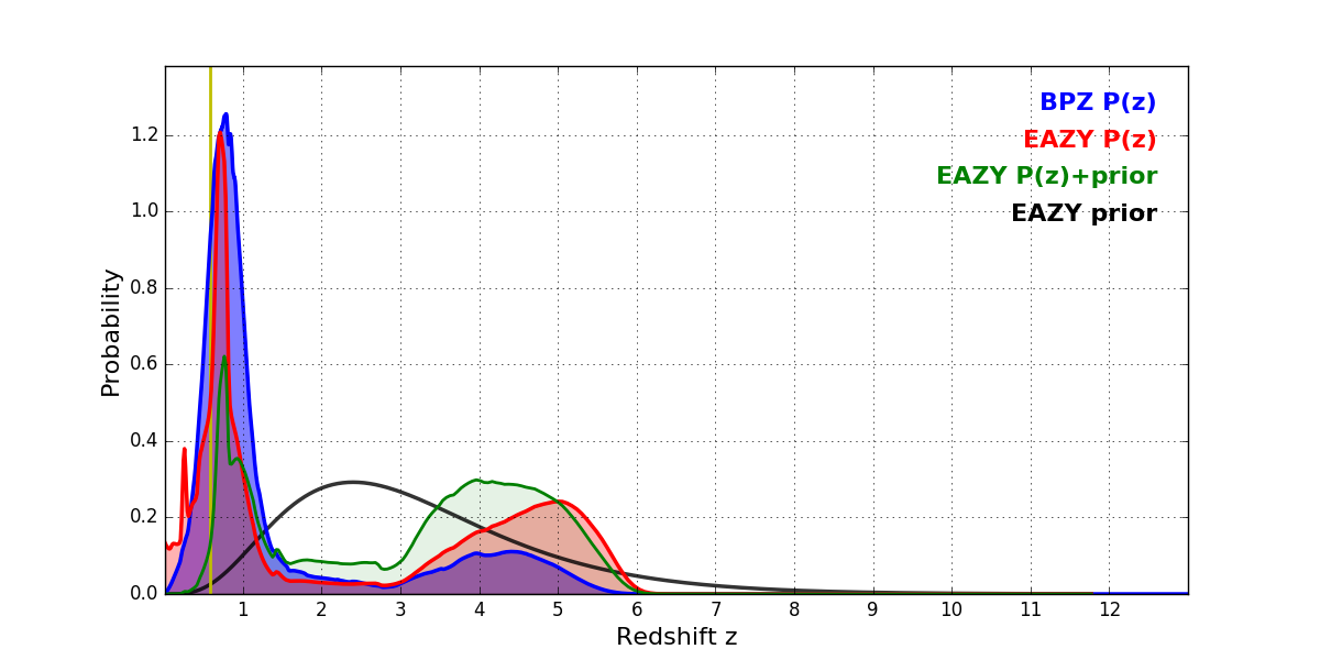 In P(z) plots: Yellow lines mark the cluster redshift z = 0.586,