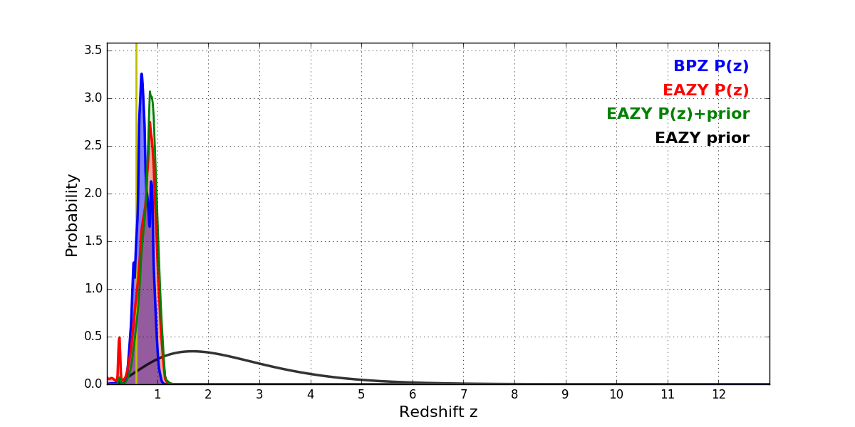 In P(z) plots: Yellow lines mark the cluster redshift z = 0.586,
