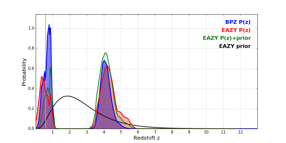 In P(z) plots: Yellow lines mark the cluster redshift z = 0.586,
