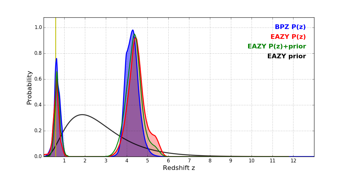 In P(z) plots: Yellow lines mark the cluster redshift z = 0.586,