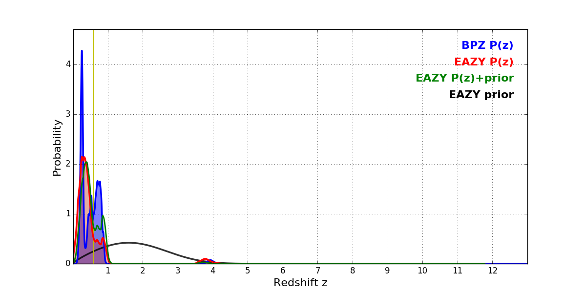 In P(z) plots: Yellow lines mark the cluster redshift z = 0.586,