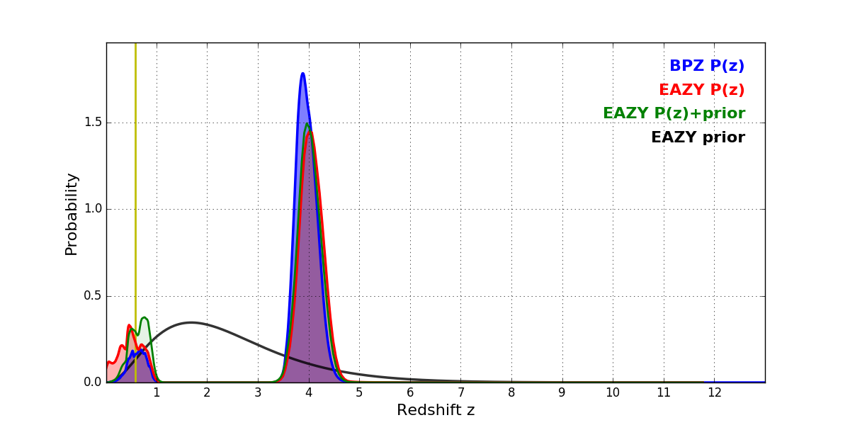 In P(z) plots: Yellow lines mark the cluster redshift z = 0.586,