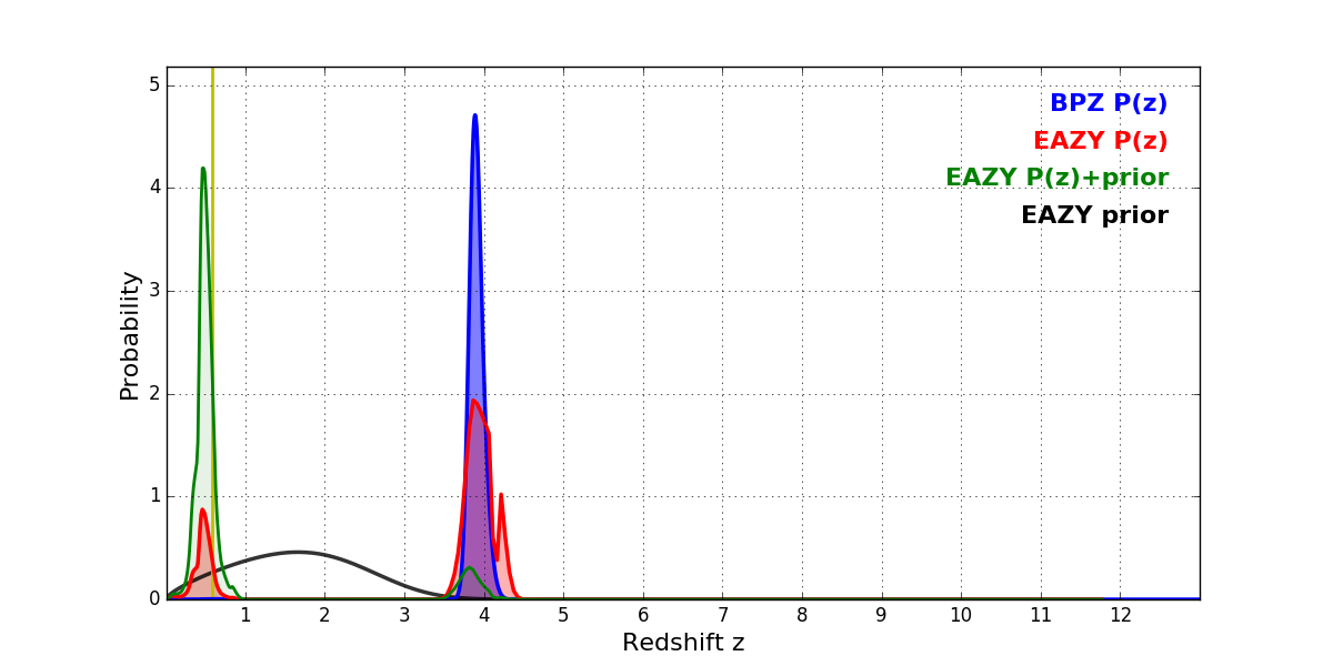 In P(z) plots: Yellow lines mark the cluster redshift z = 0.586,