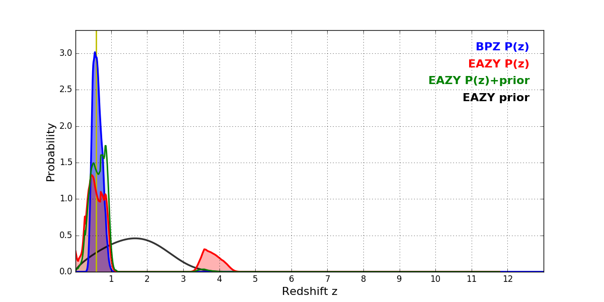 In P(z) plots: Yellow lines mark the cluster redshift z = 0.586,
