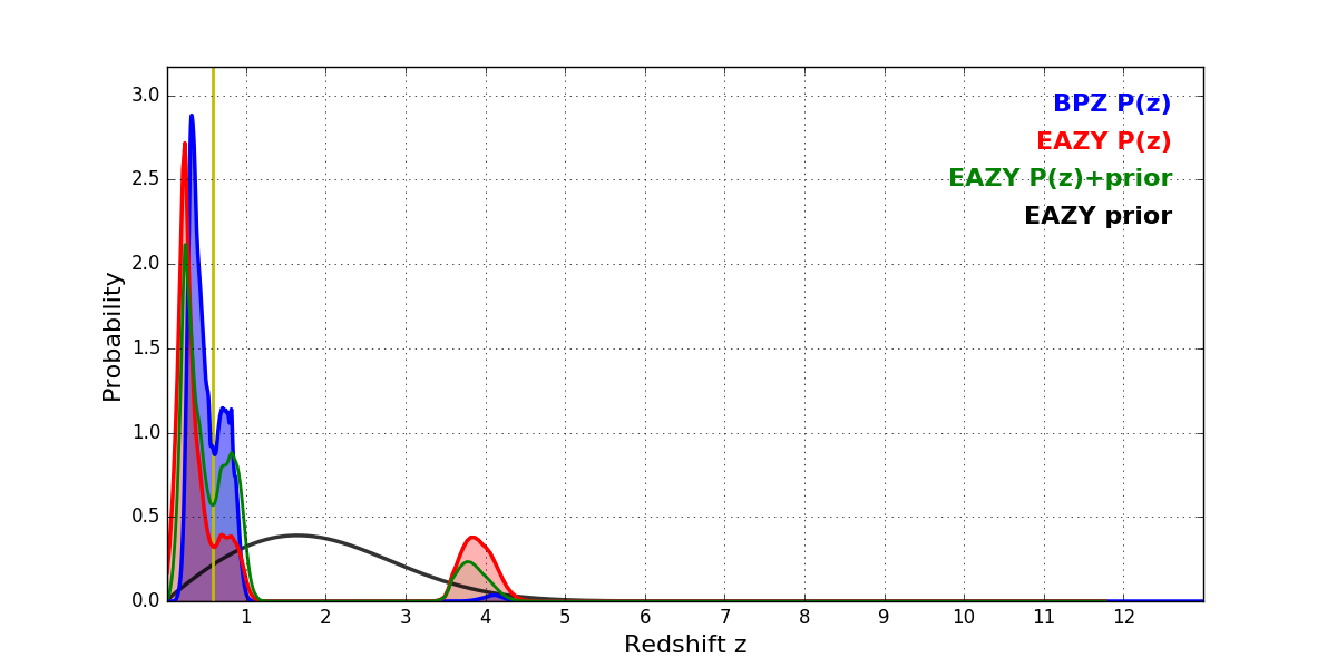 In P(z) plots: Yellow lines mark the cluster redshift z = 0.586,