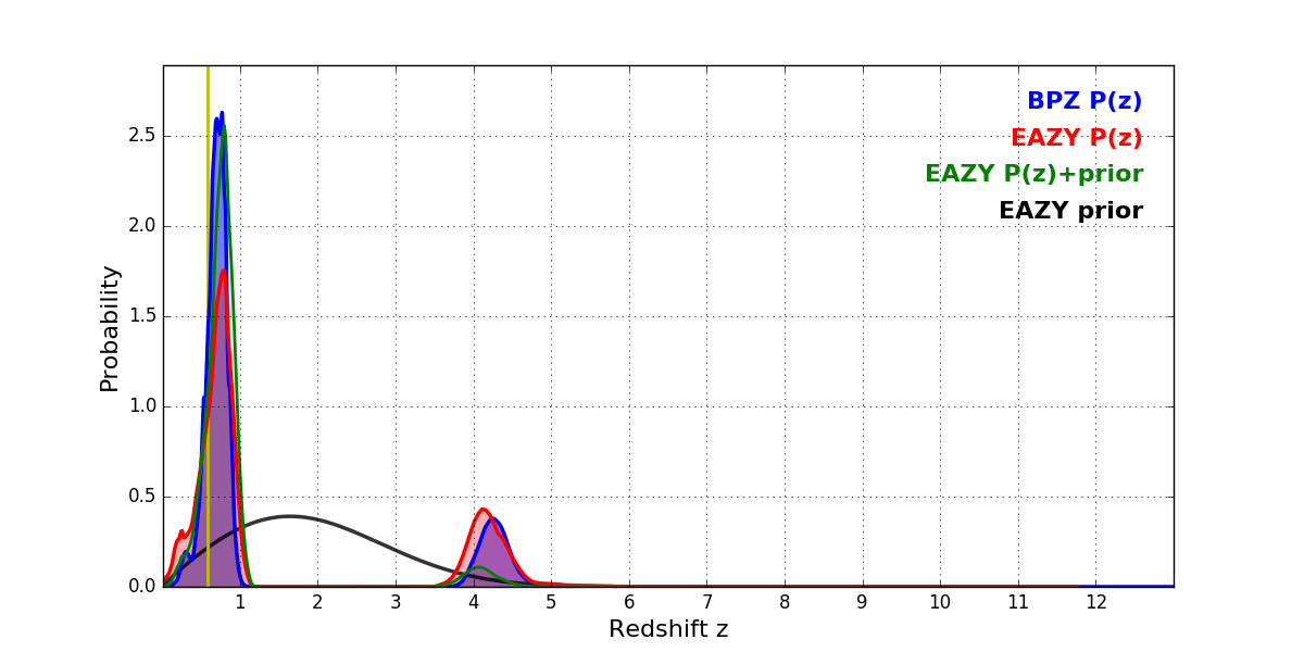 In P(z) plots: Yellow lines mark the cluster redshift z = 0.586,