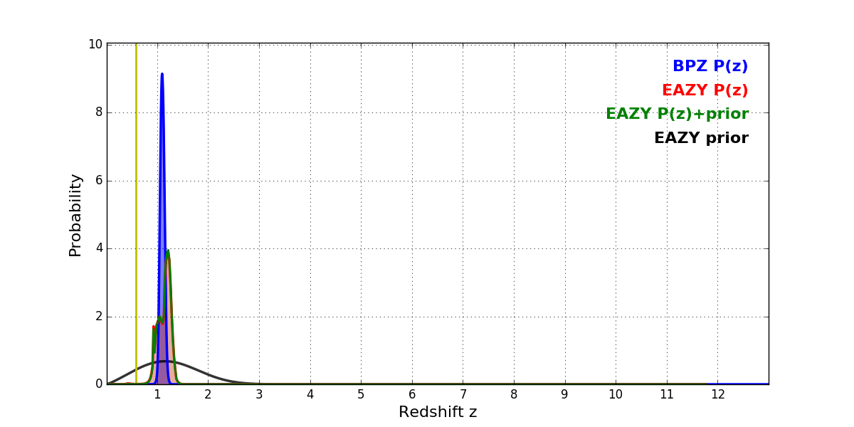 In P(z) plots: Yellow lines mark the cluster redshift z = 0.586,