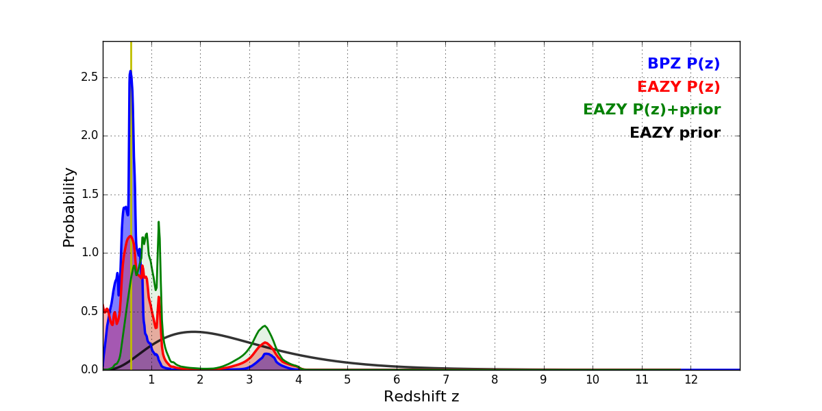 In P(z) plots: Yellow lines mark the cluster redshift z = 0.586,