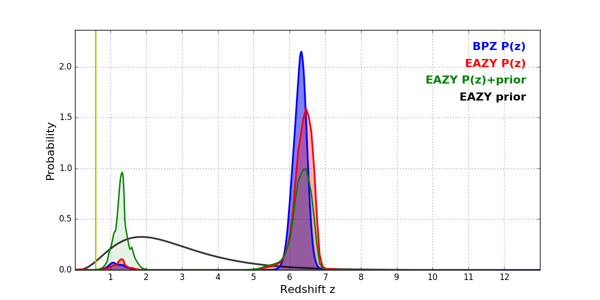 In P(z) plots: Yellow lines mark the cluster redshift z = 0.586,