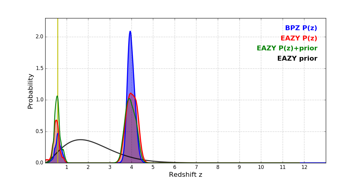 In P(z) plots: Yellow lines mark the cluster redshift z = 0.586,