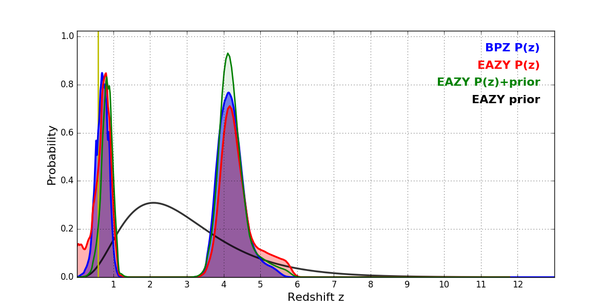 In P(z) plots: Yellow lines mark the cluster redshift z = 0.586,