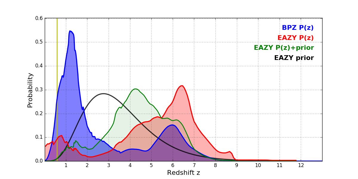 In P(z) plots: Yellow lines mark the cluster redshift z = 0.586,