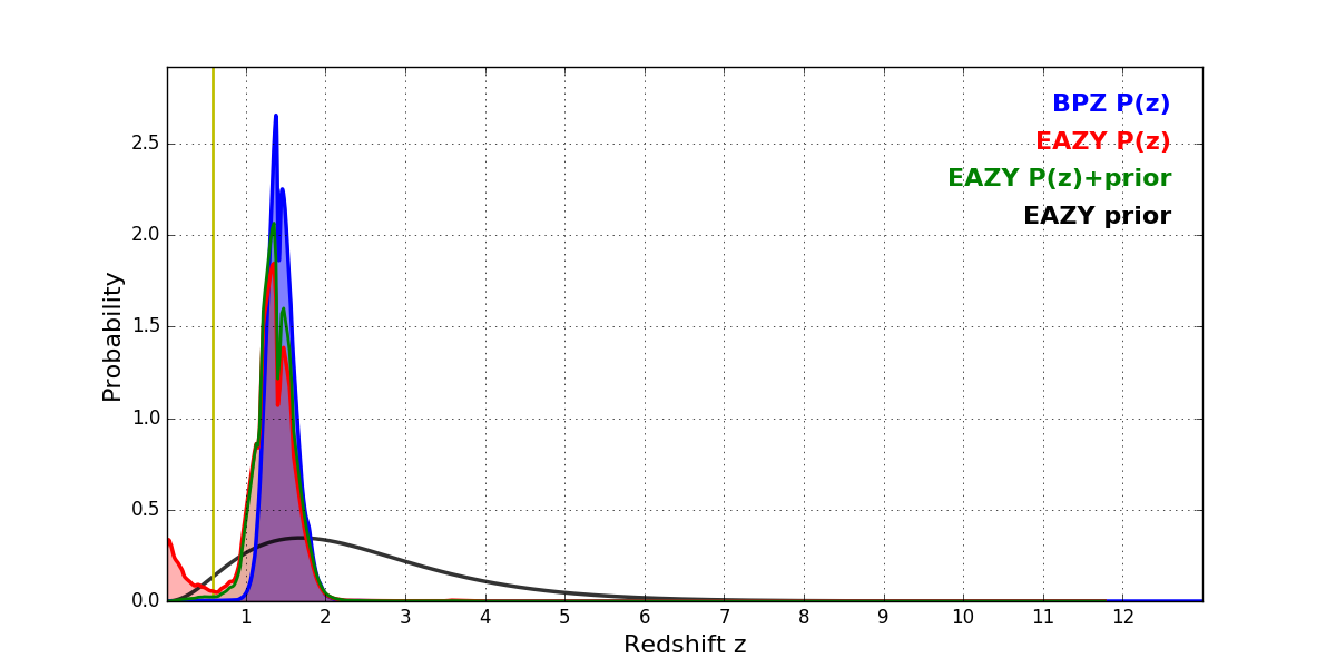 In P(z) plots: Yellow lines mark the cluster redshift z = 0.586,