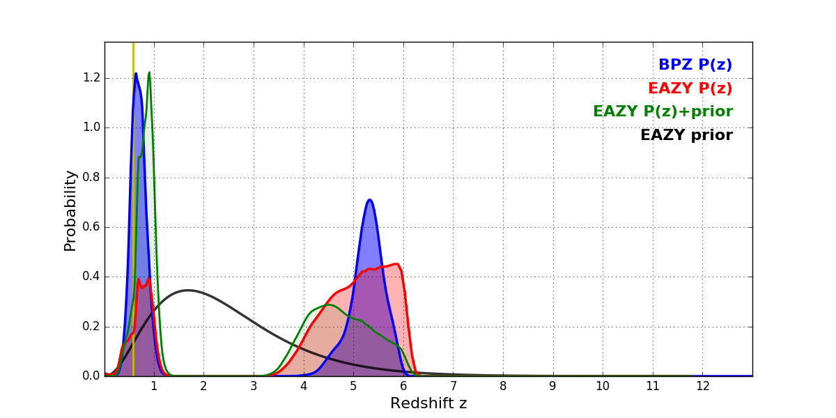 In P(z) plots: Yellow lines mark the cluster redshift z = 0.586,