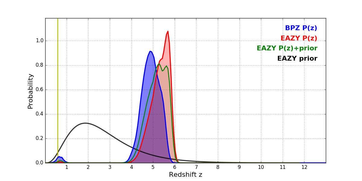 In P(z) plots: Yellow lines mark the cluster redshift z = 0.586,