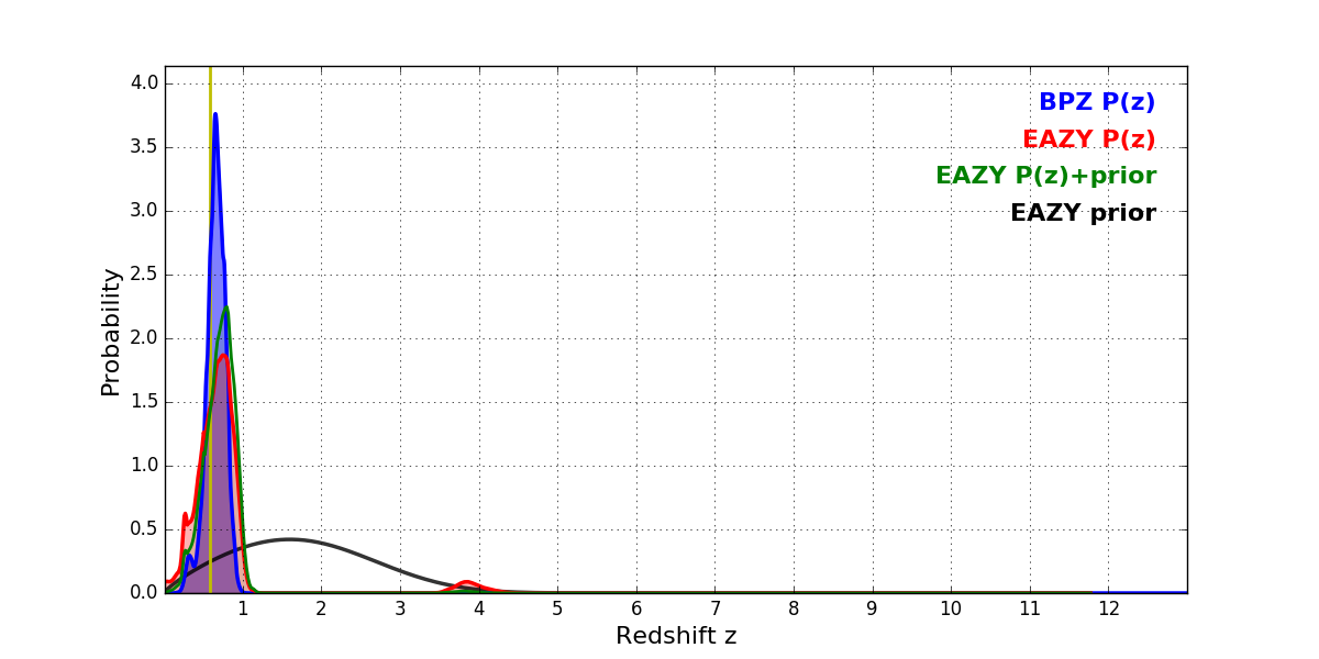 In P(z) plots: Yellow lines mark the cluster redshift z = 0.586,