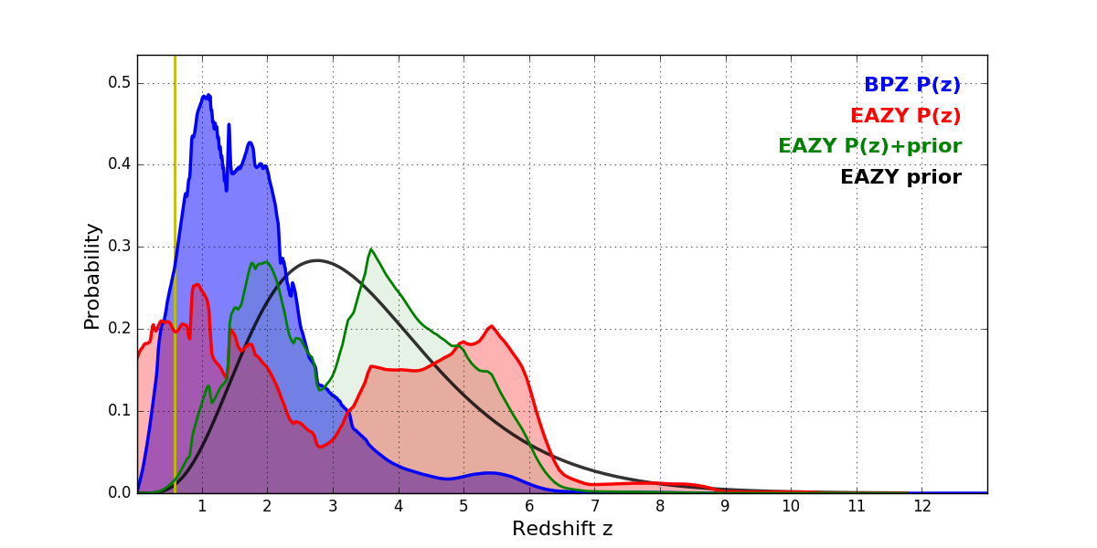 In P(z) plots: Yellow lines mark the cluster redshift z = 0.586,