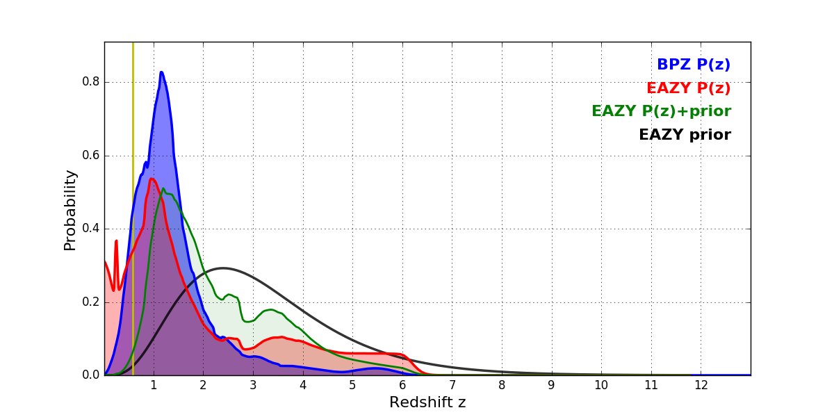 In P(z) plots: Yellow lines mark the cluster redshift z = 0.586,