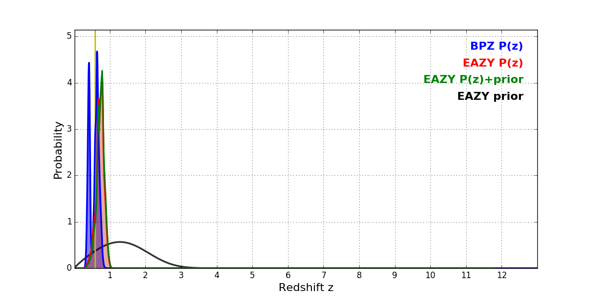 In P(z) plots: Yellow lines mark the cluster redshift z = 0.586,