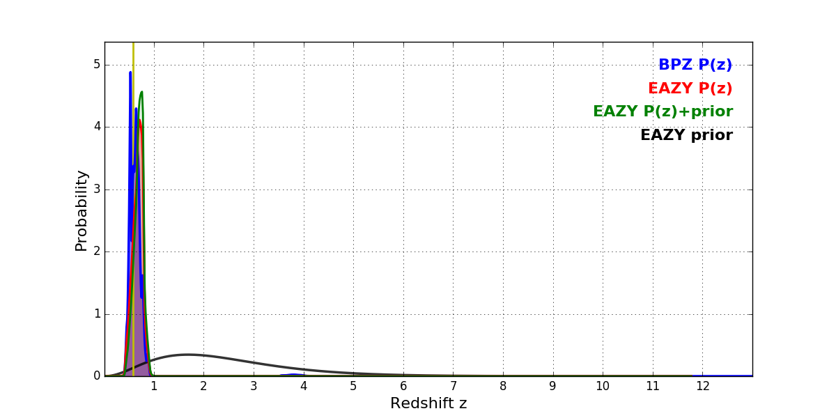In P(z) plots: Yellow lines mark the cluster redshift z = 0.586,