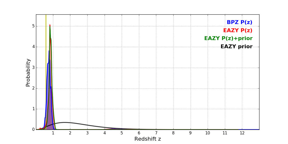 In P(z) plots: Yellow lines mark the cluster redshift z = 0.586,