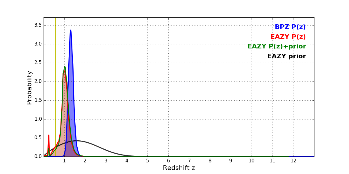 In P(z) plots: Yellow lines mark the cluster redshift z = 0.586,
