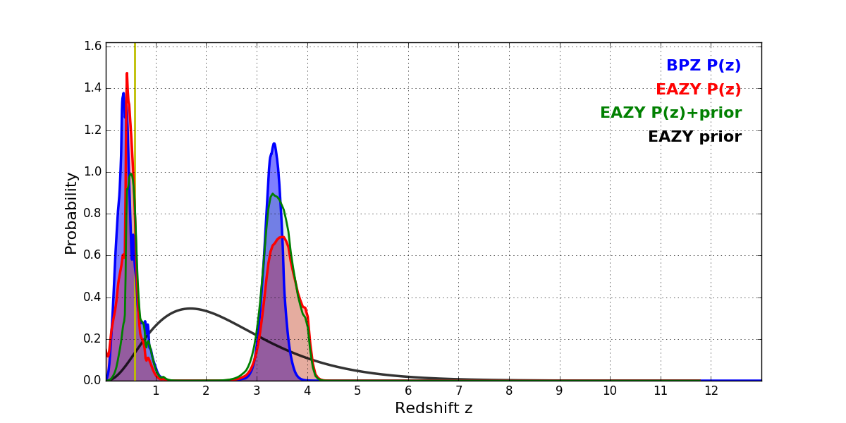 In P(z) plots: Yellow lines mark the cluster redshift z = 0.586,