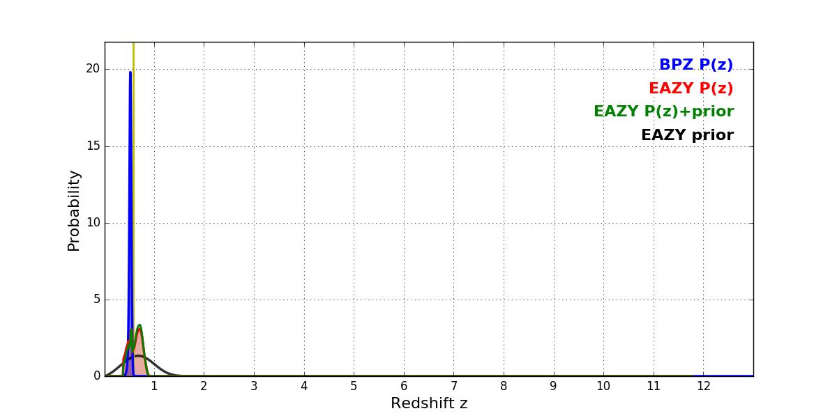 In P(z) plots: Yellow lines mark the cluster redshift z = 0.586,