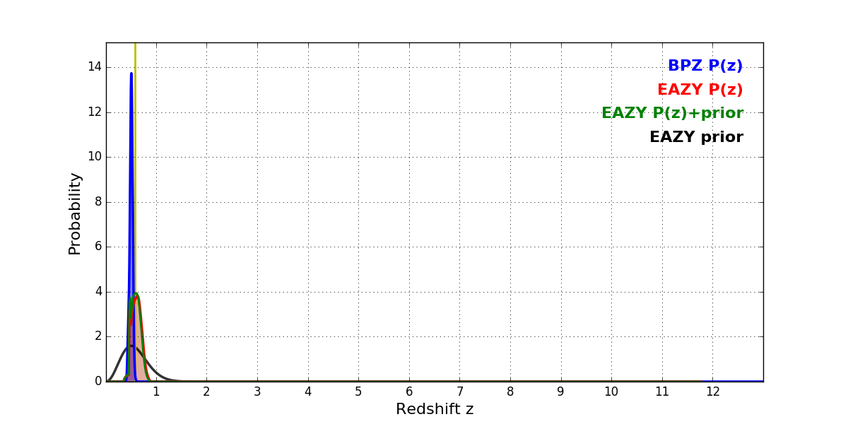 In P(z) plots: Yellow lines mark the cluster redshift z = 0.586,