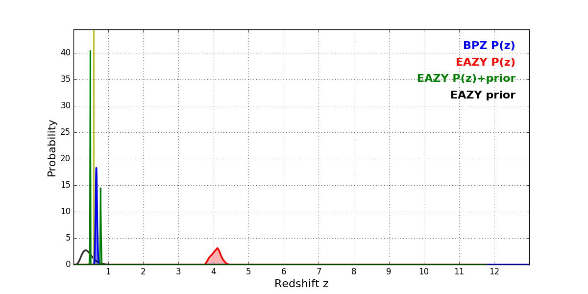 In P(z) plots: Yellow lines mark the cluster redshift z = 0.586,