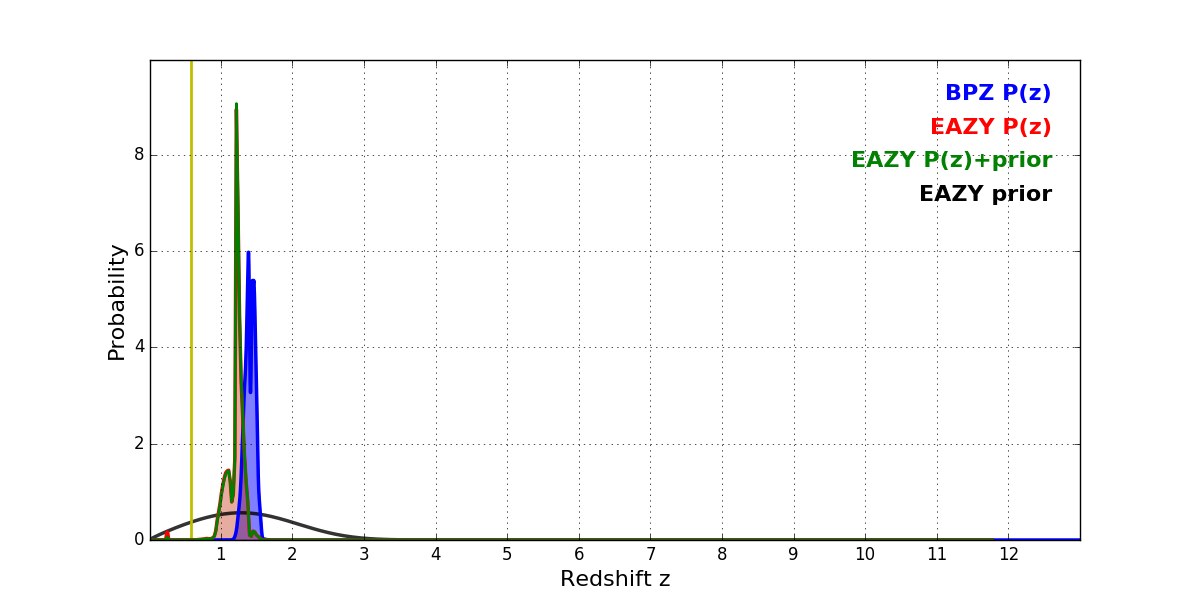 In P(z) plots: Yellow lines mark the cluster redshift z = 0.586,