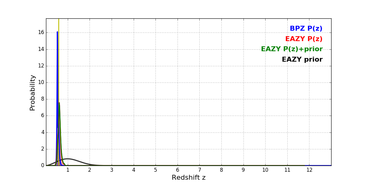 In P(z) plots: Yellow lines mark the cluster redshift z = 0.586,