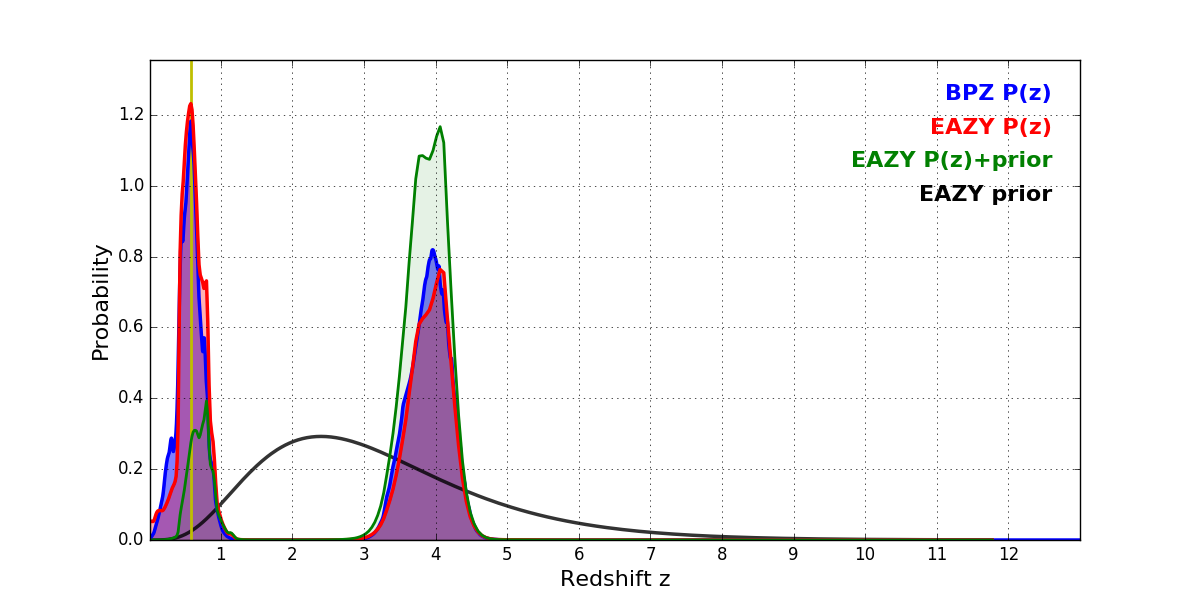 In P(z) plots: Yellow lines mark the cluster redshift z = 0.586,