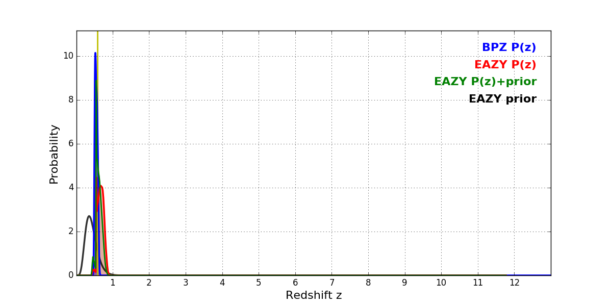 In P(z) plots: Yellow lines mark the cluster redshift z = 0.586,