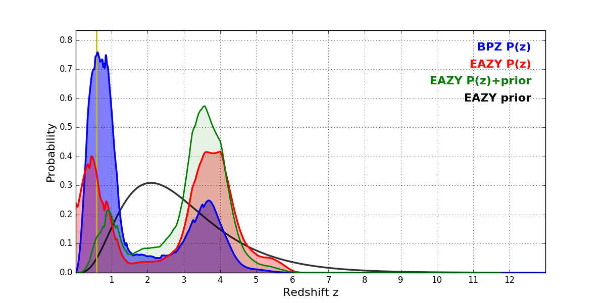 In P(z) plots: Yellow lines mark the cluster redshift z = 0.586,