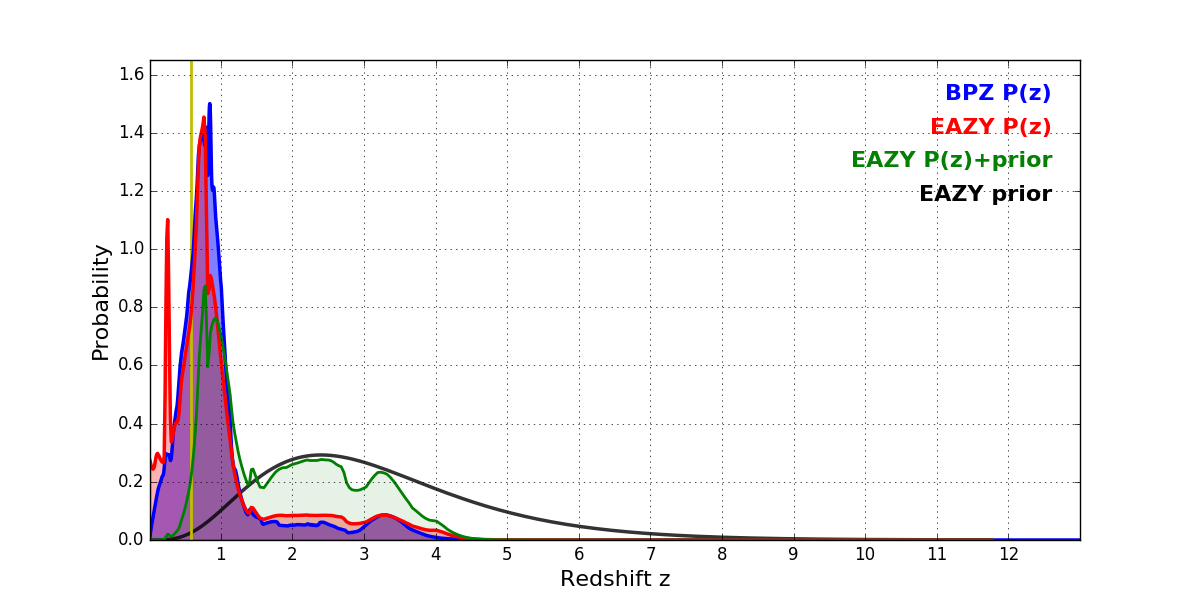 In P(z) plots: Yellow lines mark the cluster redshift z = 0.586,