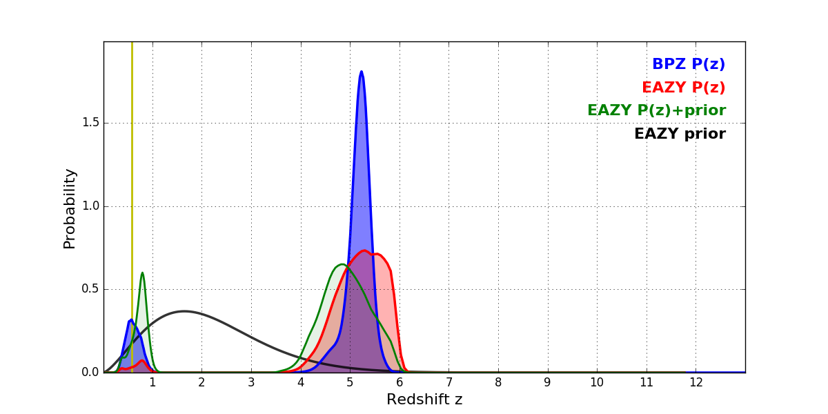In P(z) plots: Yellow lines mark the cluster redshift z = 0.586,