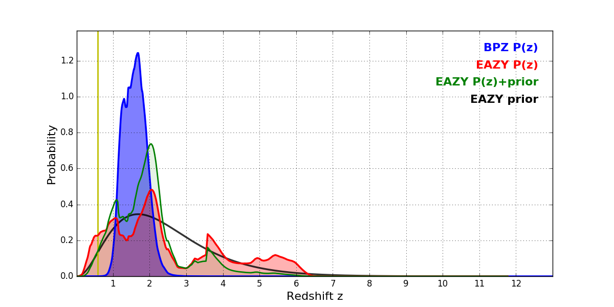 In P(z) plots: Yellow lines mark the cluster redshift z = 0.586,