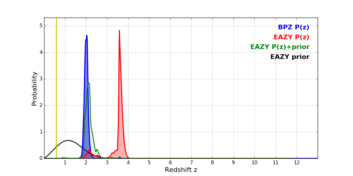 In P(z) plots: Yellow lines mark the cluster redshift z = 0.586,