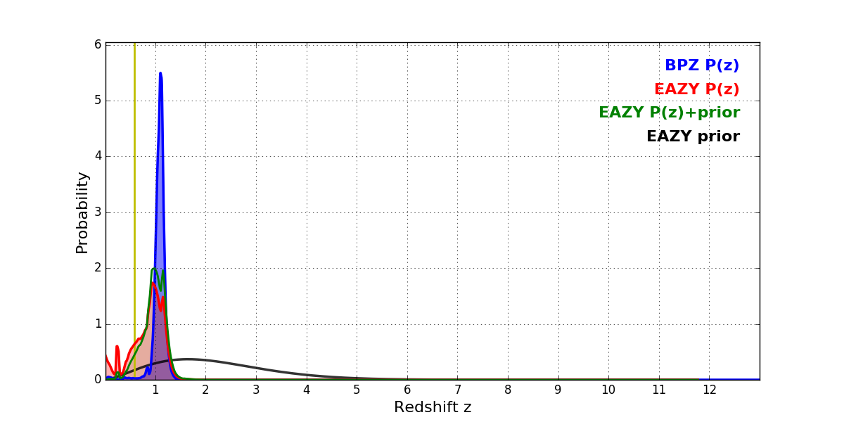In P(z) plots: Yellow lines mark the cluster redshift z = 0.586,