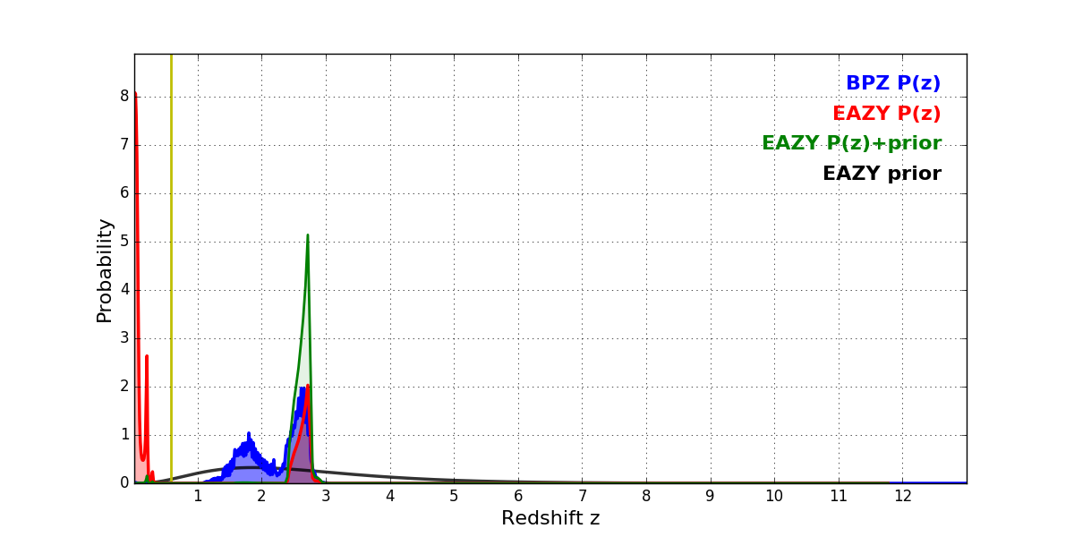 In P(z) plots: Yellow lines mark the cluster redshift z = 0.586,