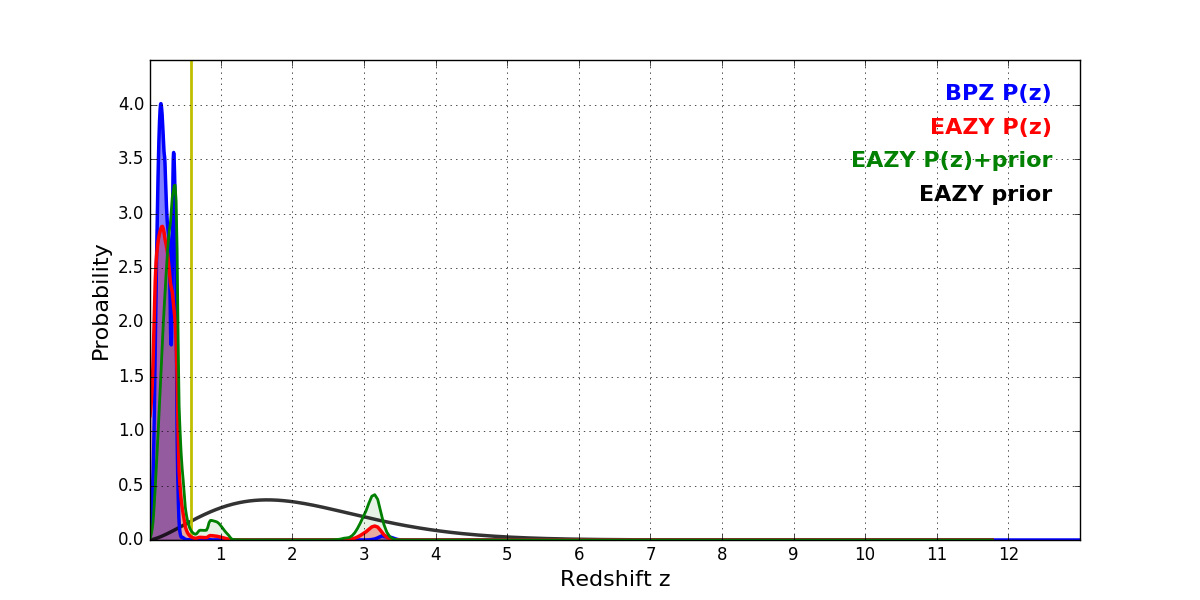 In P(z) plots: Yellow lines mark the cluster redshift z = 0.586,