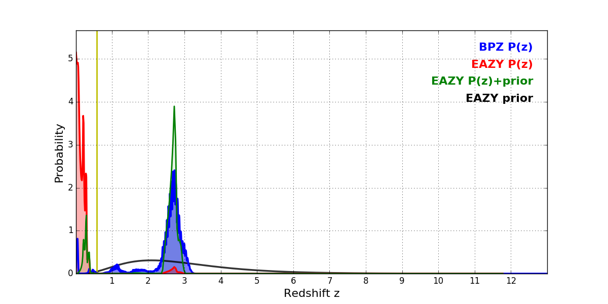 In P(z) plots: Yellow lines mark the cluster redshift z = 0.586,