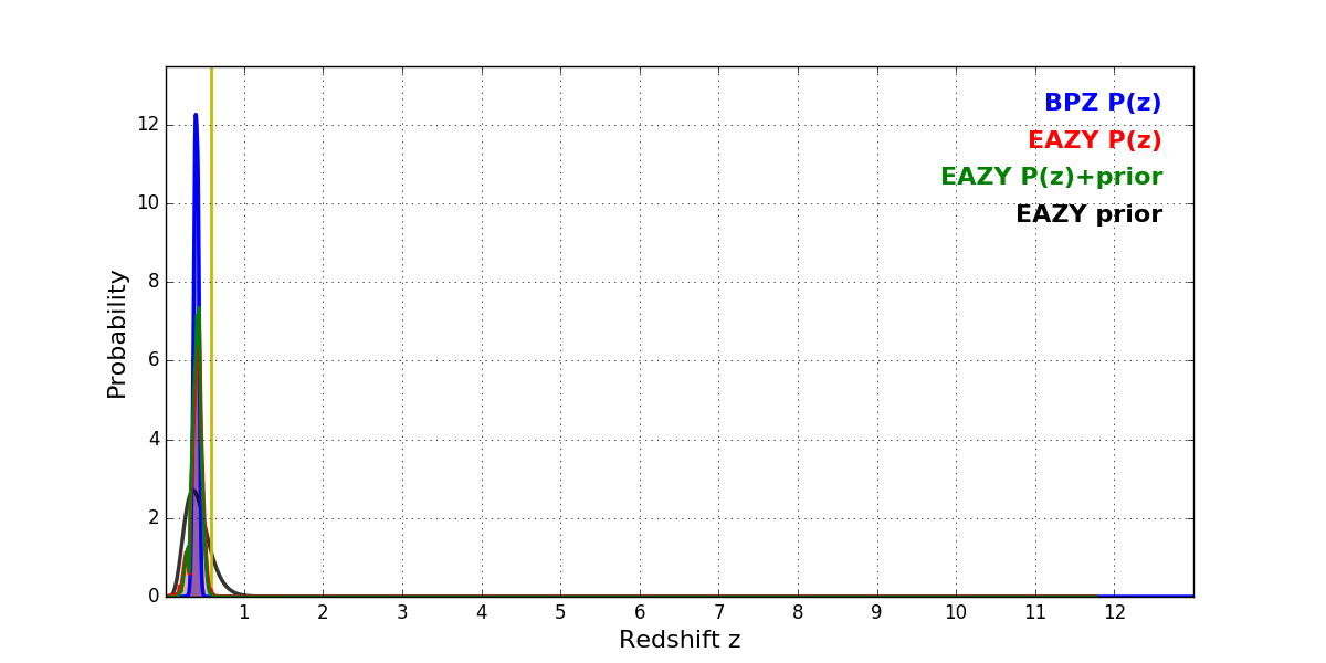 In P(z) plots: Yellow lines mark the cluster redshift z = 0.586,