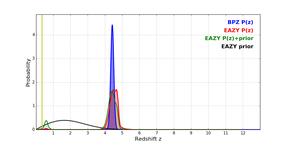 In P(z) plots: Yellow lines mark the cluster redshift z = 0.352,