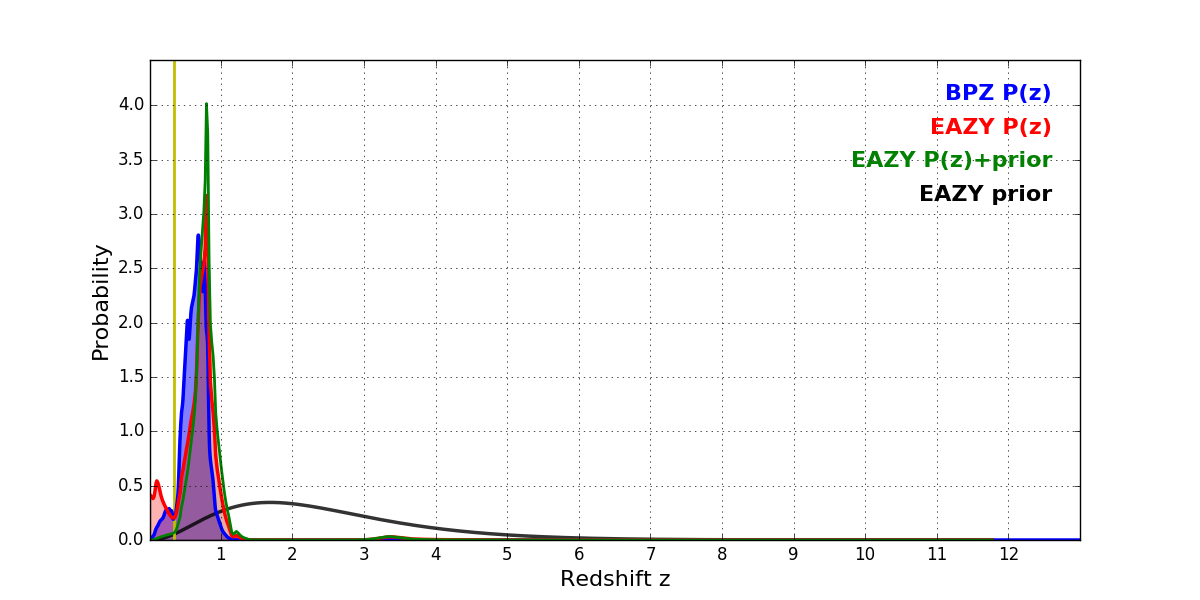In P(z) plots: Yellow lines mark the cluster redshift z = 0.352,