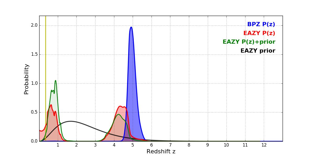 In P(z) plots: Yellow lines mark the cluster redshift z = 0.352,