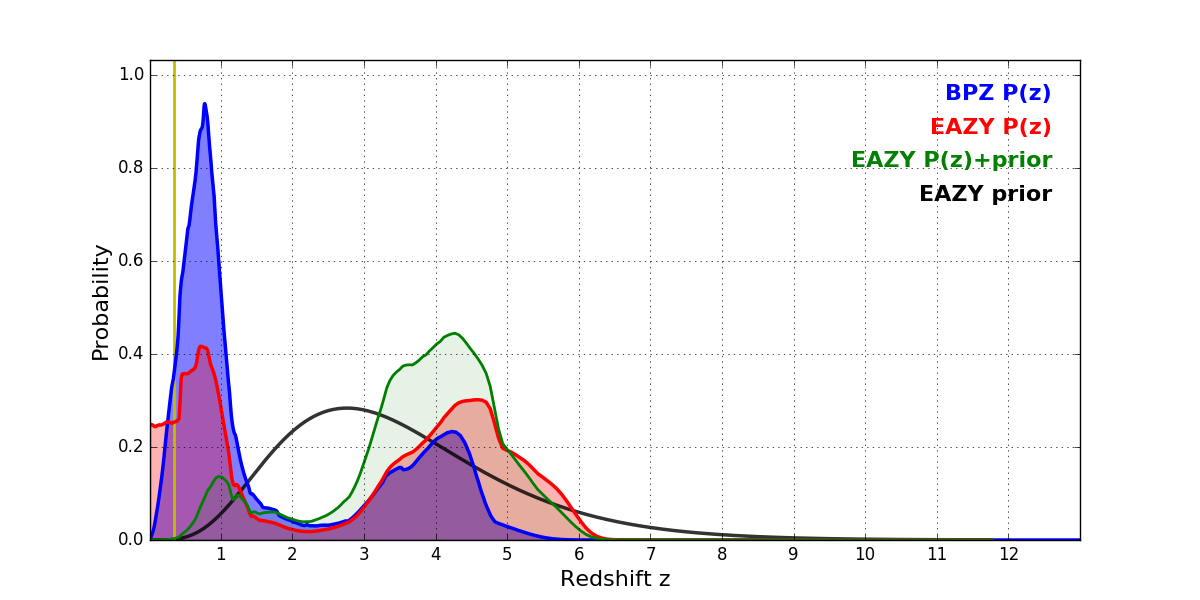 In P(z) plots: Yellow lines mark the cluster redshift z = 0.352,