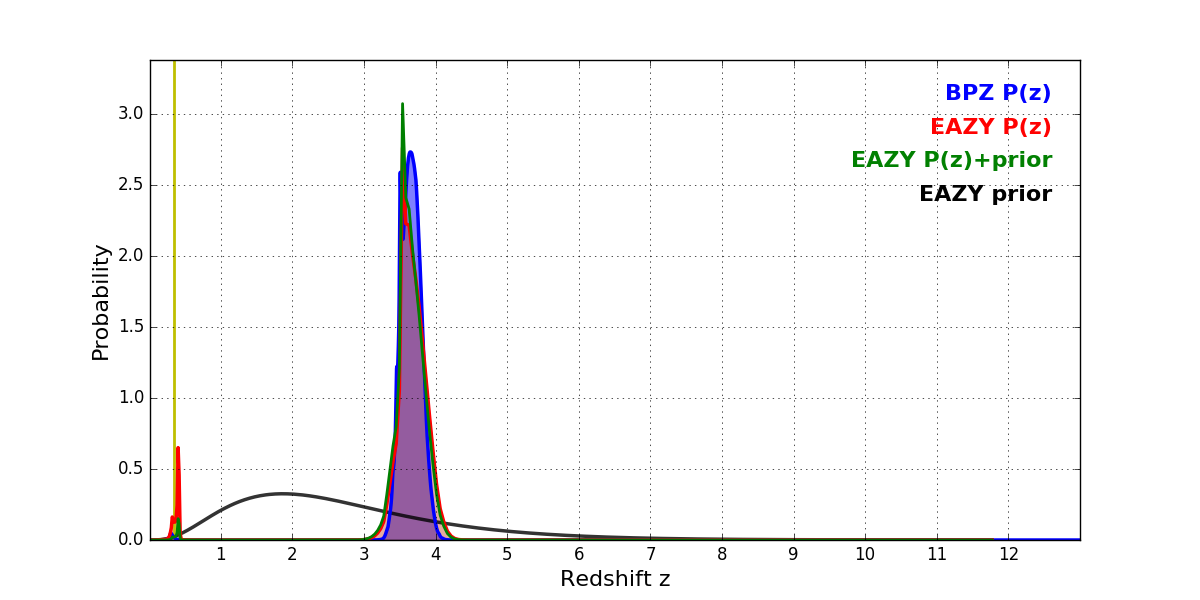 In P(z) plots: Yellow lines mark the cluster redshift z = 0.352,